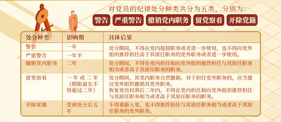 《中國共產(chǎn)黨紀律處分條例》規(guī)定,對黨員的紀律處分種類共分為五類,分別為警告、嚴重警告、撤銷黨內(nèi)職務(wù)、留黨察看和開除黨籍。